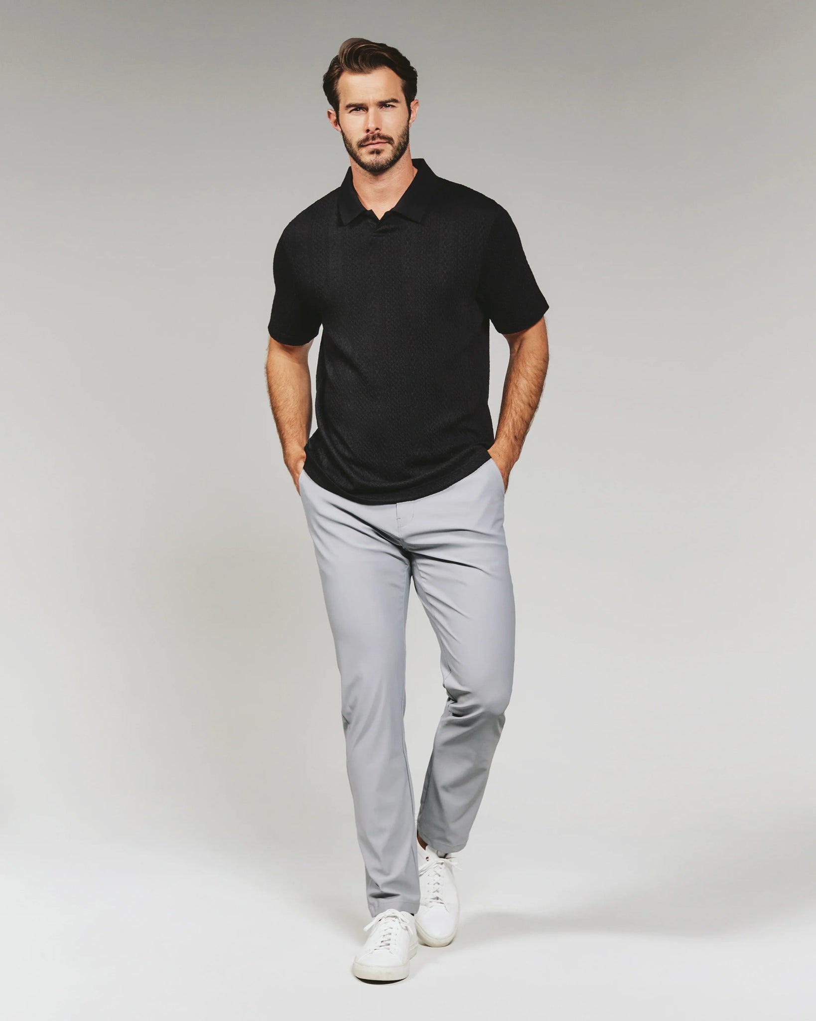 A soft, lightweight, and breathable sweater polo made with a classic knitwear pattern. Features an open placket with ribbed Johnny collar and side vents for ease of movement.