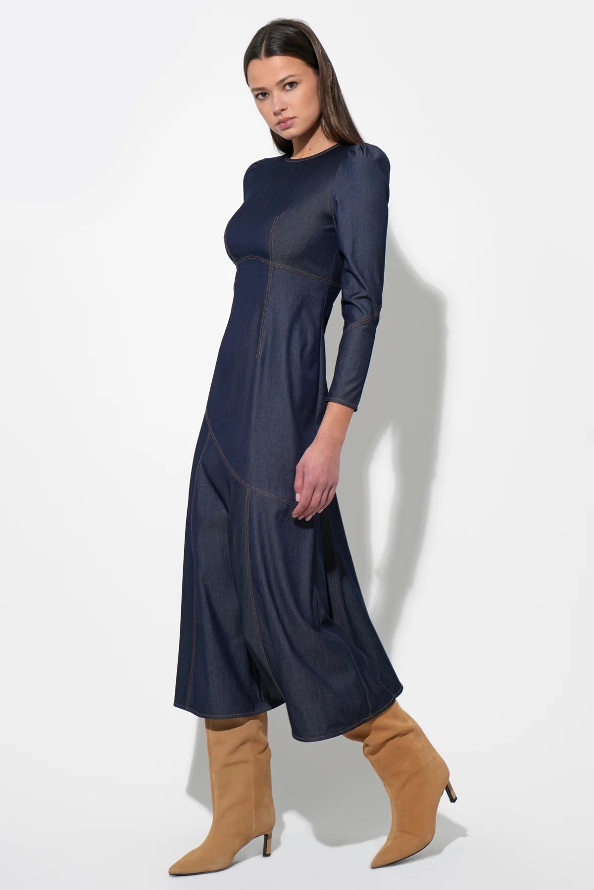 It is made from a structured denim-like fabric in a medium blue shade with contrasting stitching that highlights the dress's architectural lines. The dress features a flattering round neckline and a midi-length A-line skirt.