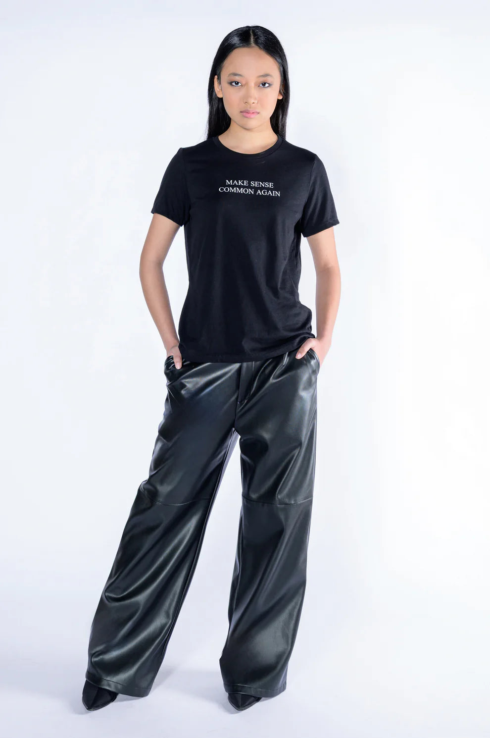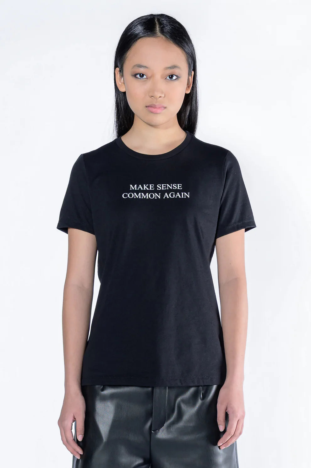 A relaxed fit t-shirt that reads "Make Sense Common Again". Designed for an effortless wear, pair with jeans and sneakers or leather pants and heels.