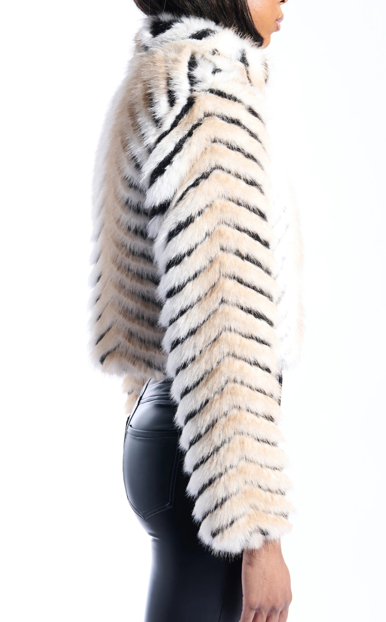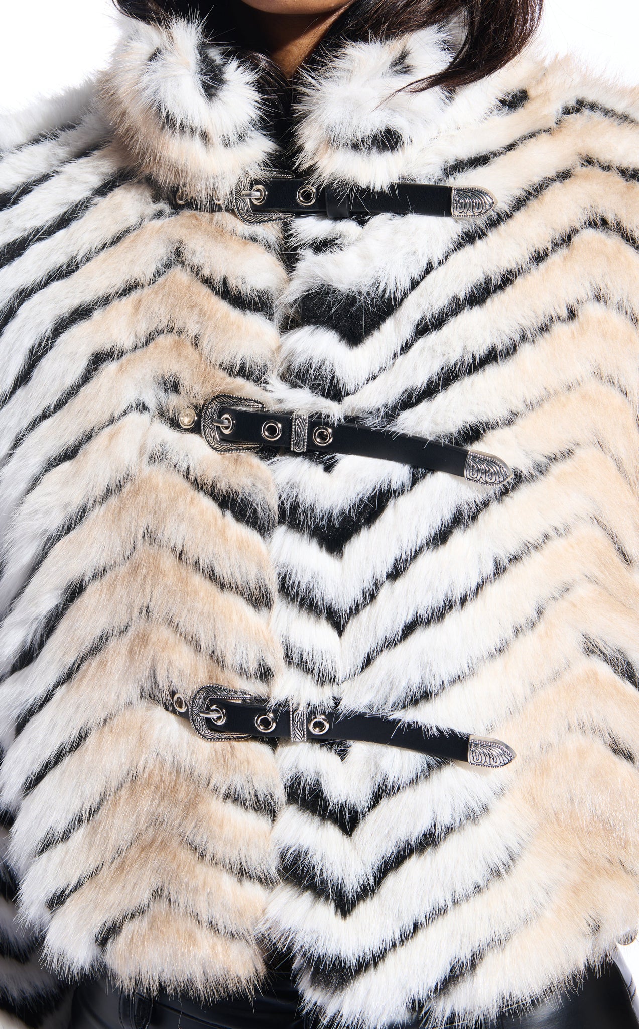 This fun faux fur jacket is the perfect statement piece for your fall wardrobe. Featuring black leather details and silver buckled front closure.