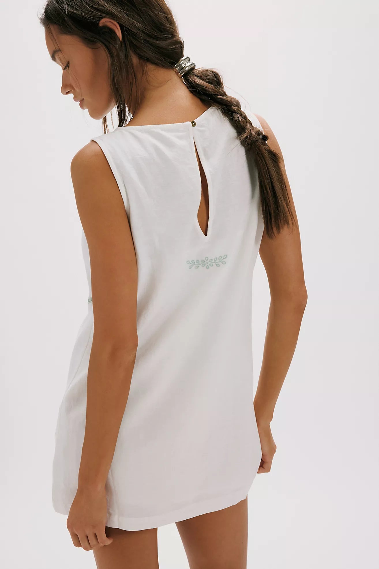 This 70s-inspired mini dress is the perfect blend of vintage charm and modern ease. Crafted from a lightweight cotton-blend, its breezy shift silhouette offers a relaxed fit that’s ideal for warm-weather days. The design is elevated by delicate embroidered detailing, a classic boat neckline, and a charming back keyhole finish. With its simple pull-on design, this sleeveless piece is an effortless go-to for a sweet, timeless look.