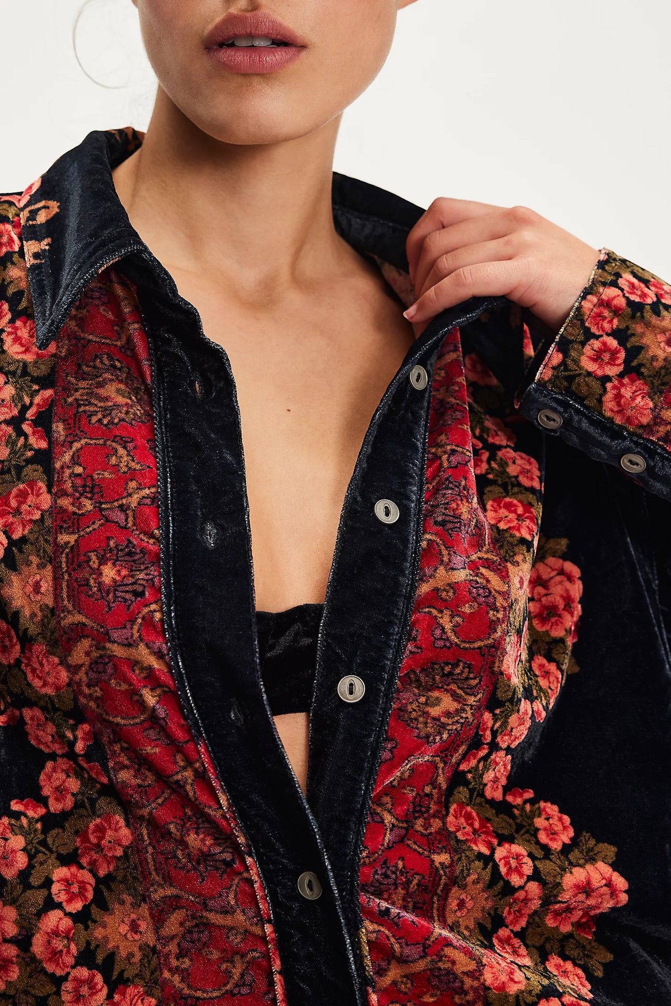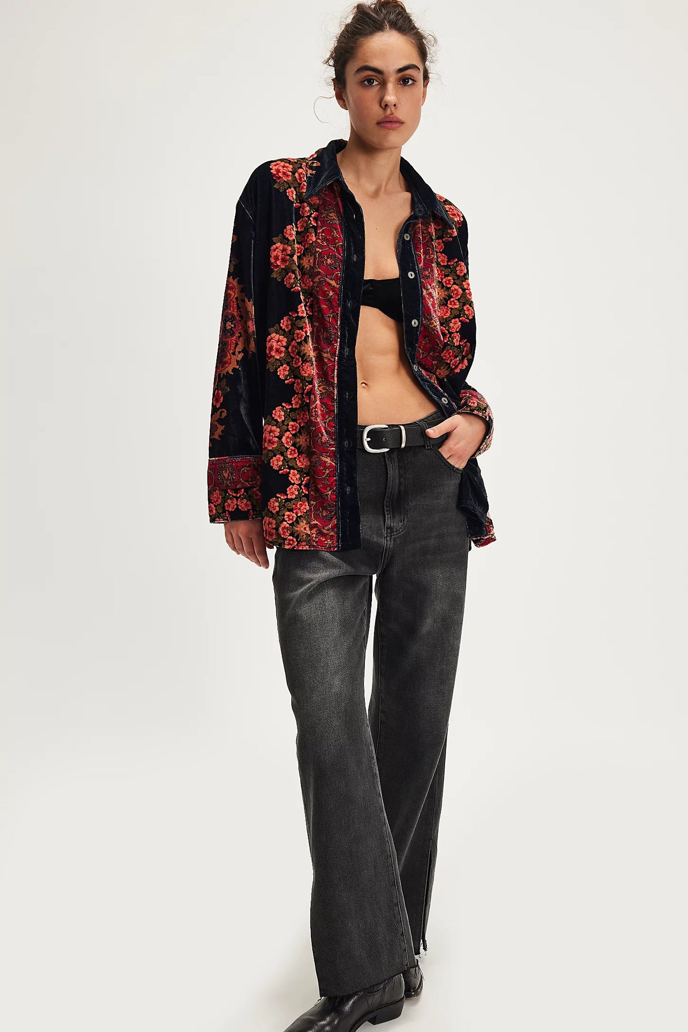 The perfect pop of print from the We The Free collection. This button-down features a soft velvet fabrication and cool contrast floral print with dropped shoulders and a collared-neckline.