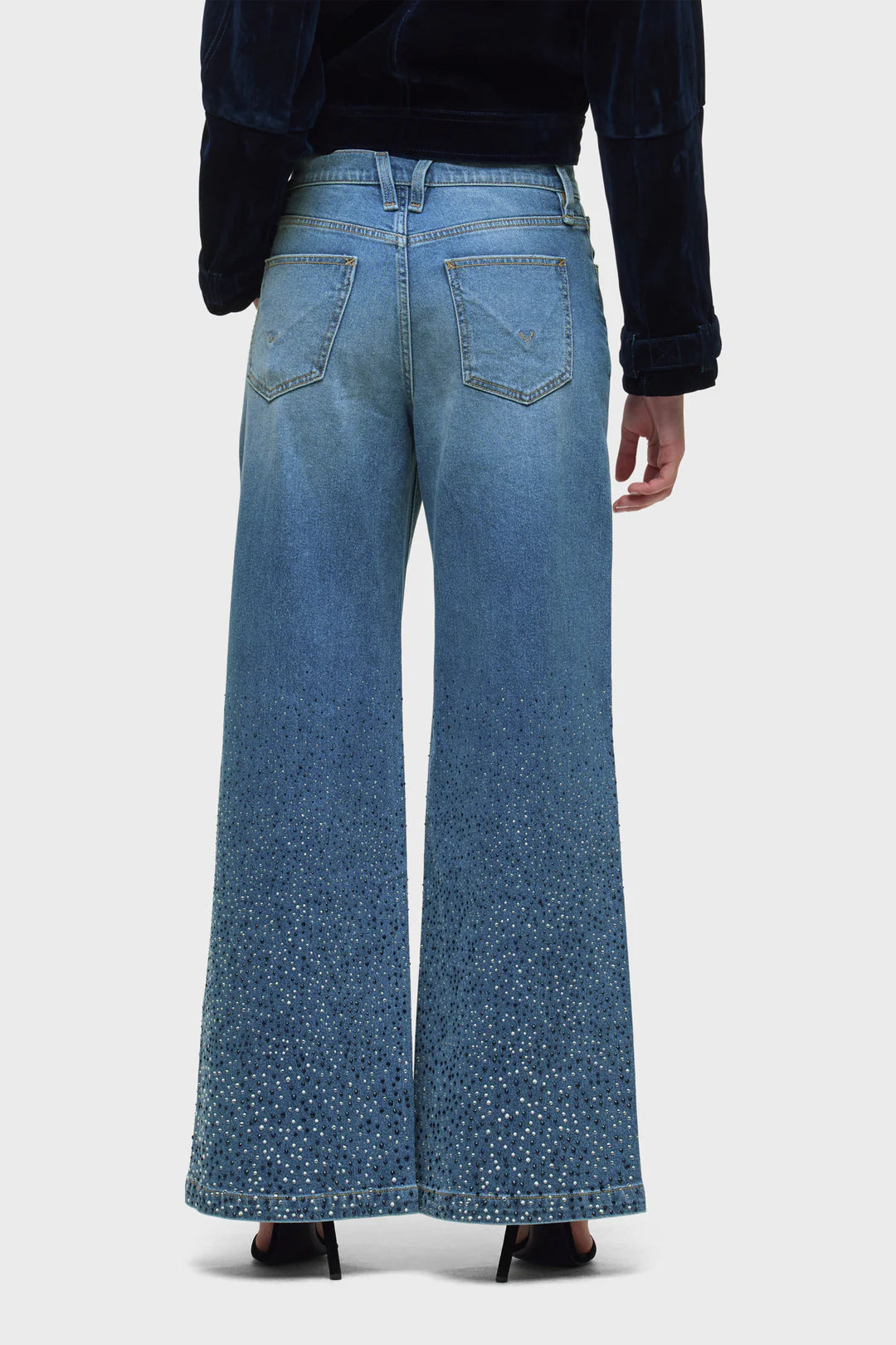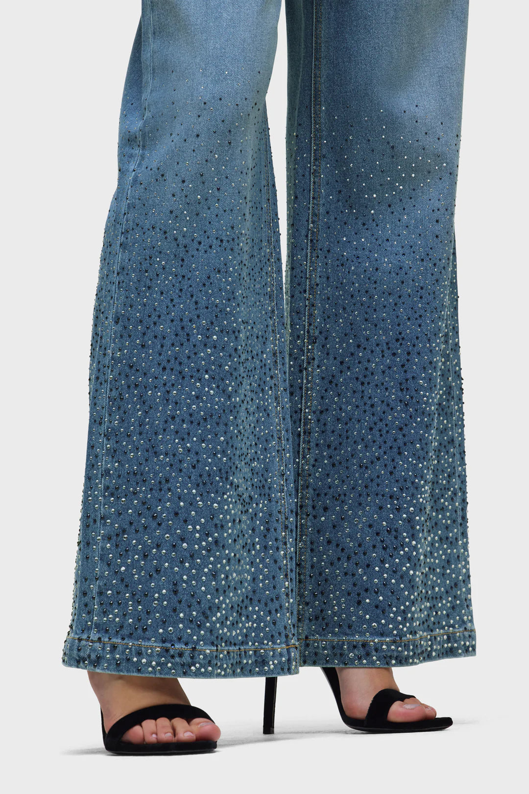 The Jodie Loose Fit Wide Leg Jean in Crystal Blue has a flattering, roomy fit with a 32" inseam. For extra glam, this pair features blue and clear studs at the bottom of legs to create an ombre effect from the bottom up. These jeans are made of low-stretch denim in a medium indigo wash with a clean finished hem.