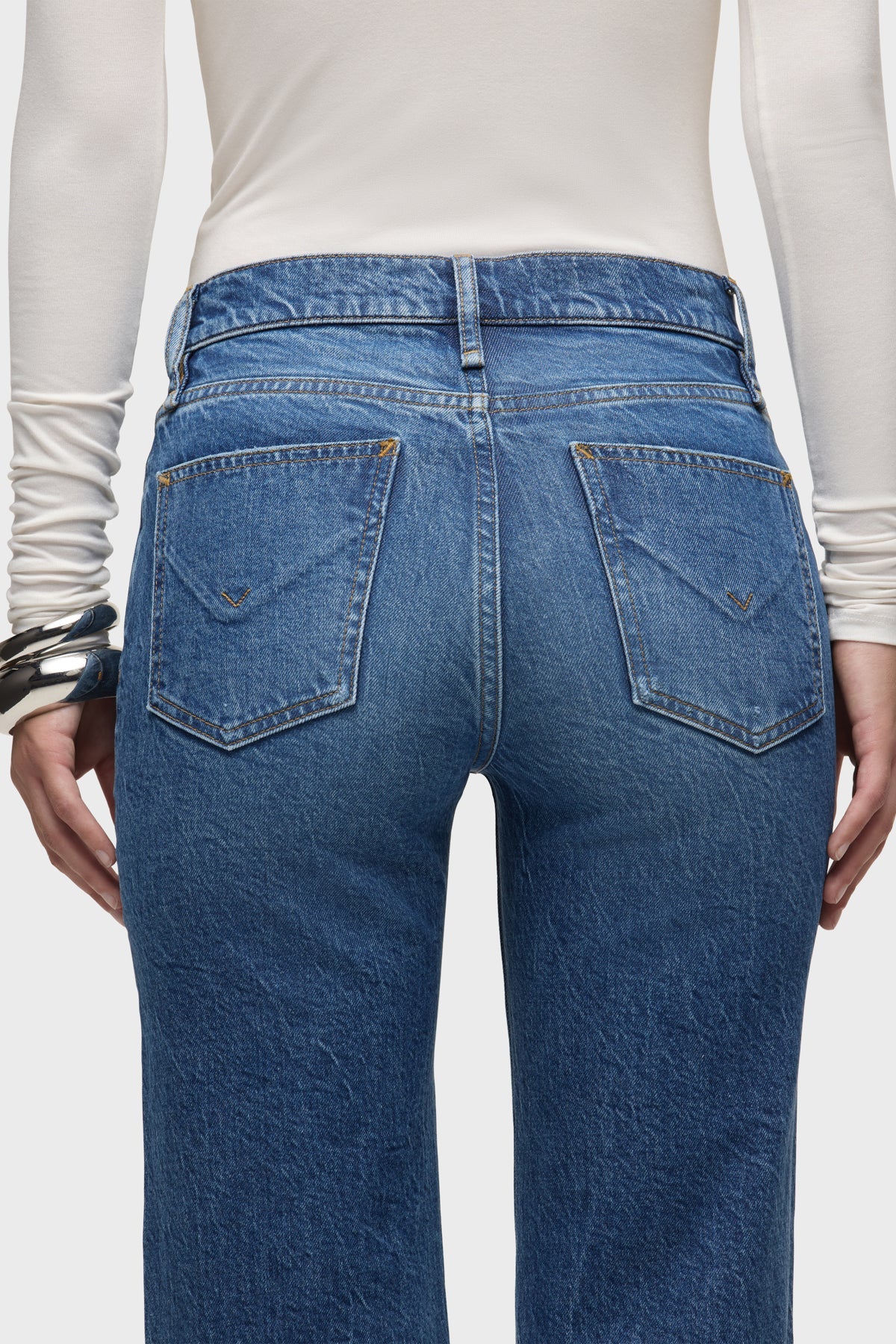 PAIGE Rosie High-Rise Wide Leg Jean in Voila is cut with a high rise, covered button fly, wide leg and clean-finished hem. It is crafted in a medium-dark wash with vintage character. The full-length 32" jean is made of true comfort stretch denim.