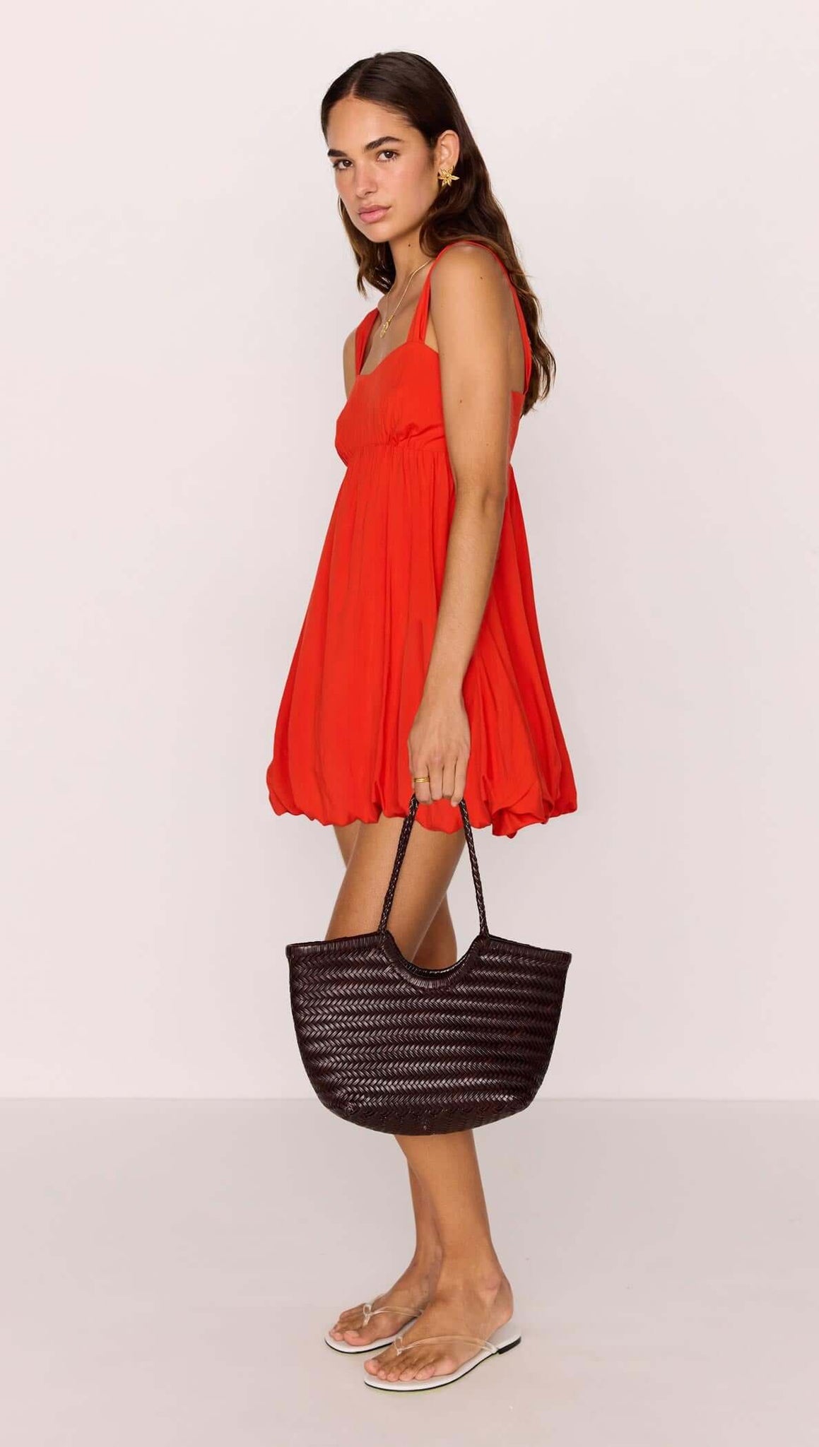 Flirty and fun, the MinkPink Scarlett Red Bubble Mini Dress is your new summer favorite. Crafted in a vibrant poppy red hue, this mini features a soft bubble hem and gathered bust for a playful silhouette that flatters every figure. The wide straps and shirred back make it easy to wear from beach days to balmy nights.
