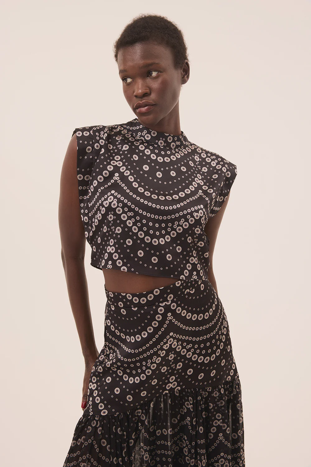 The Inah is a chic, modern crop top cut from our lustrous Stranded Pearl satin. This sleeveless silhouette features a structured, wide-set shoulder line and a high neckline with a double back-button closure. Pair it with the coordinating Yara skirt for the perfect set to wear to all your holiday soirées.