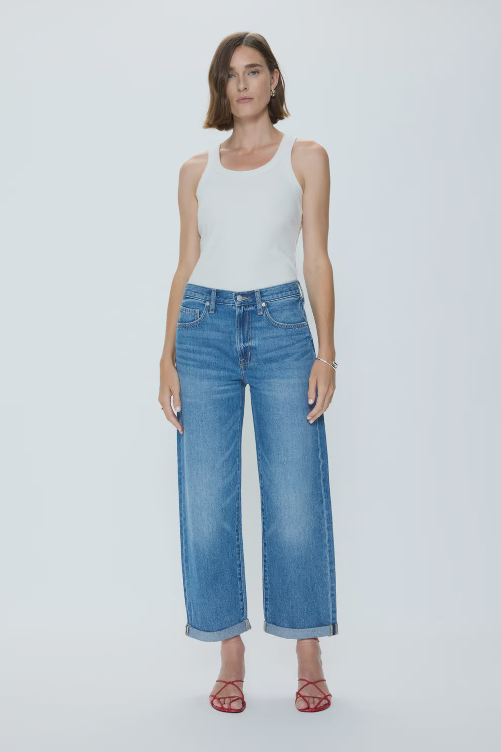 Introducing a new perspective on the boyfriend fit. Donny features a high rise and relaxed top block that opens into a softly bowed wide leg, finished with a double rolled cuff. Crafted in a light indigo wash with natural fading and whiskering, Donny delivers an off-duty sensibility. Pair with the Bibi Denim Jacket for a matching set.