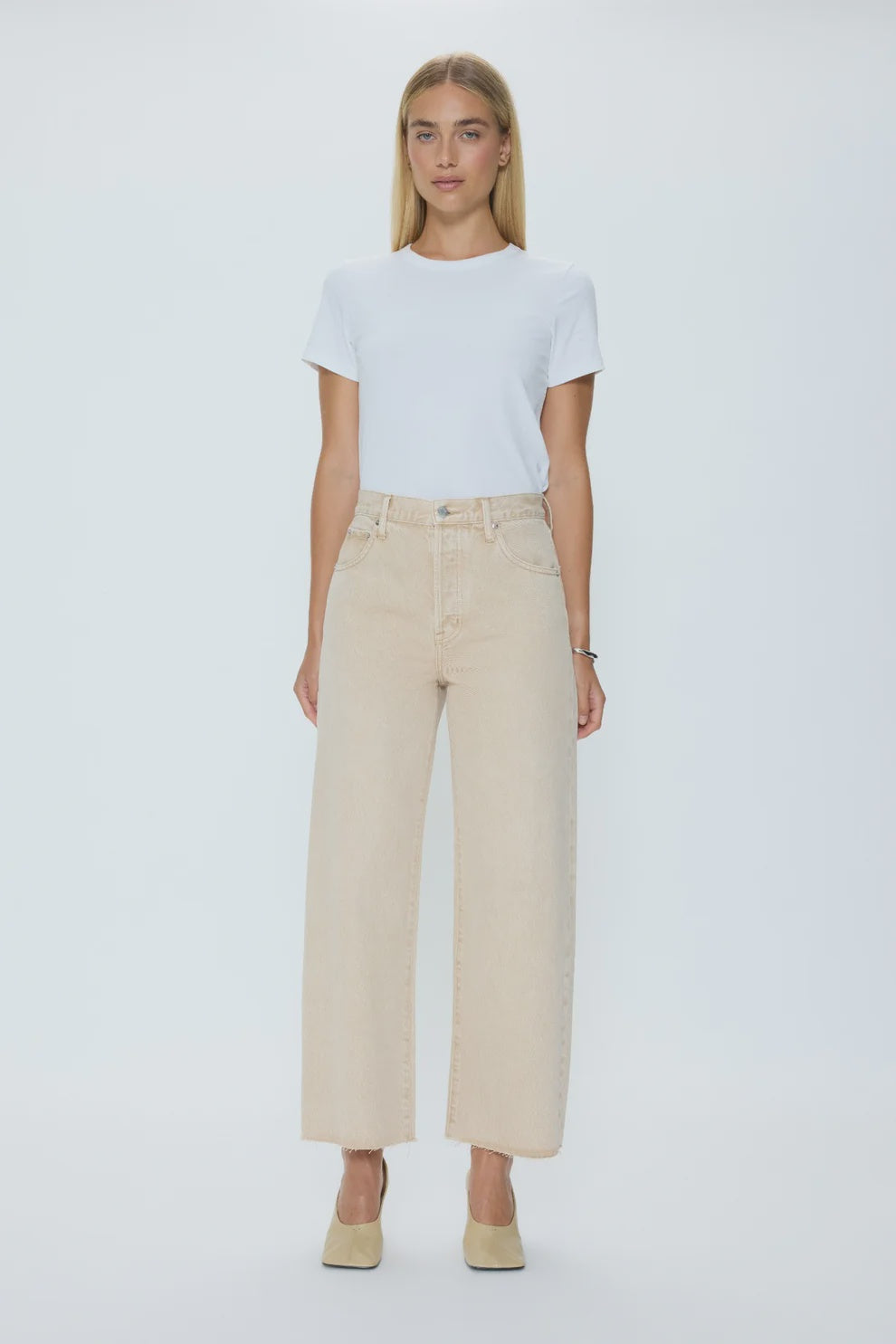 Designed with a high rise and dimensional bowed leg, Tate offers modern proportions with a clean, cropped length. Rigid 100% cotton denim creates a structured silhouette and contoured shape with a precise fit. Dune, a muted beige wash is the soft neutral that pairs seamlessly with any palette.