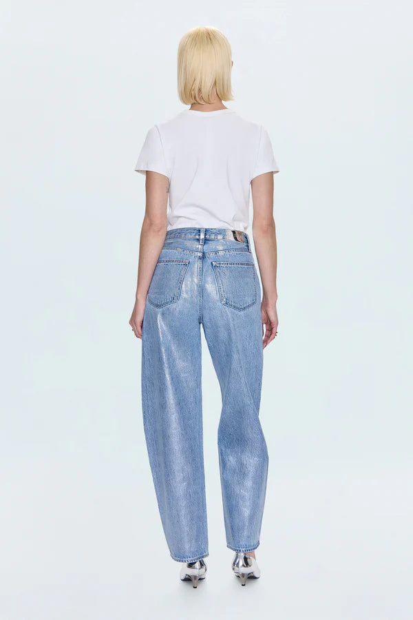 The best-selling jean that redefines modern denim. Wes sits at a flattering high rise with a stylish barrel leg silhouette and full-length 30" inseam that creates sophisticated drama. Clean hem finishes add polished detail to the contemporary silhouette. Crafted from our premium rigid non-stretch denim in Spellbound, a captivating light blue wash with a luminous sheen that catches the light beautifully. Finished with a branded metallic patch on the back that adds signature shine.