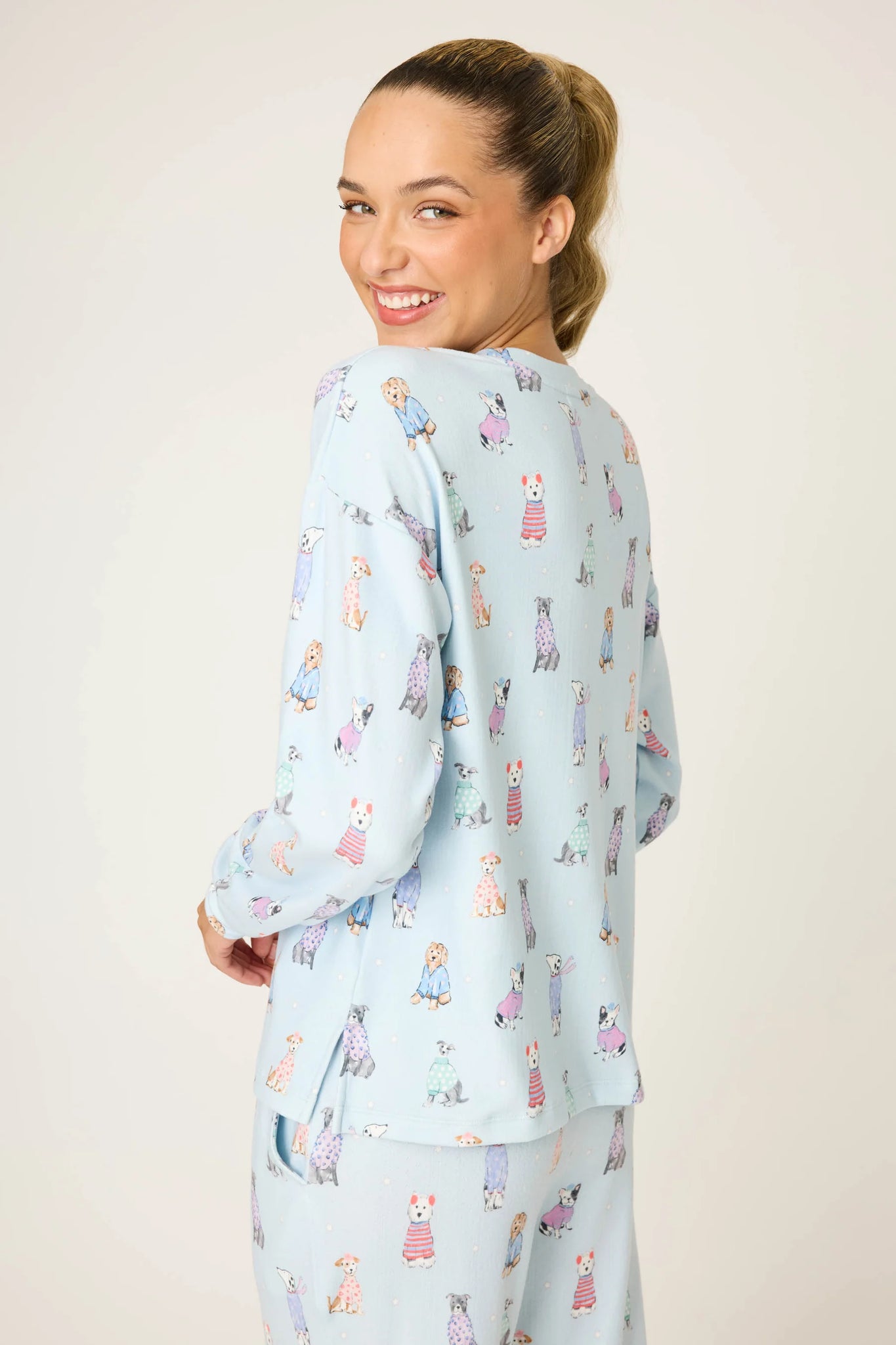 The PJ Salvage Doggone Cold Long Sleeve Top features a charming, multi-breed canine print set against a serene blue haze backdrop. This whimsical piece is designed with a classic crew neckline and a relaxed, comfortable fit, making it an essential addition to your curated loungewear collection.