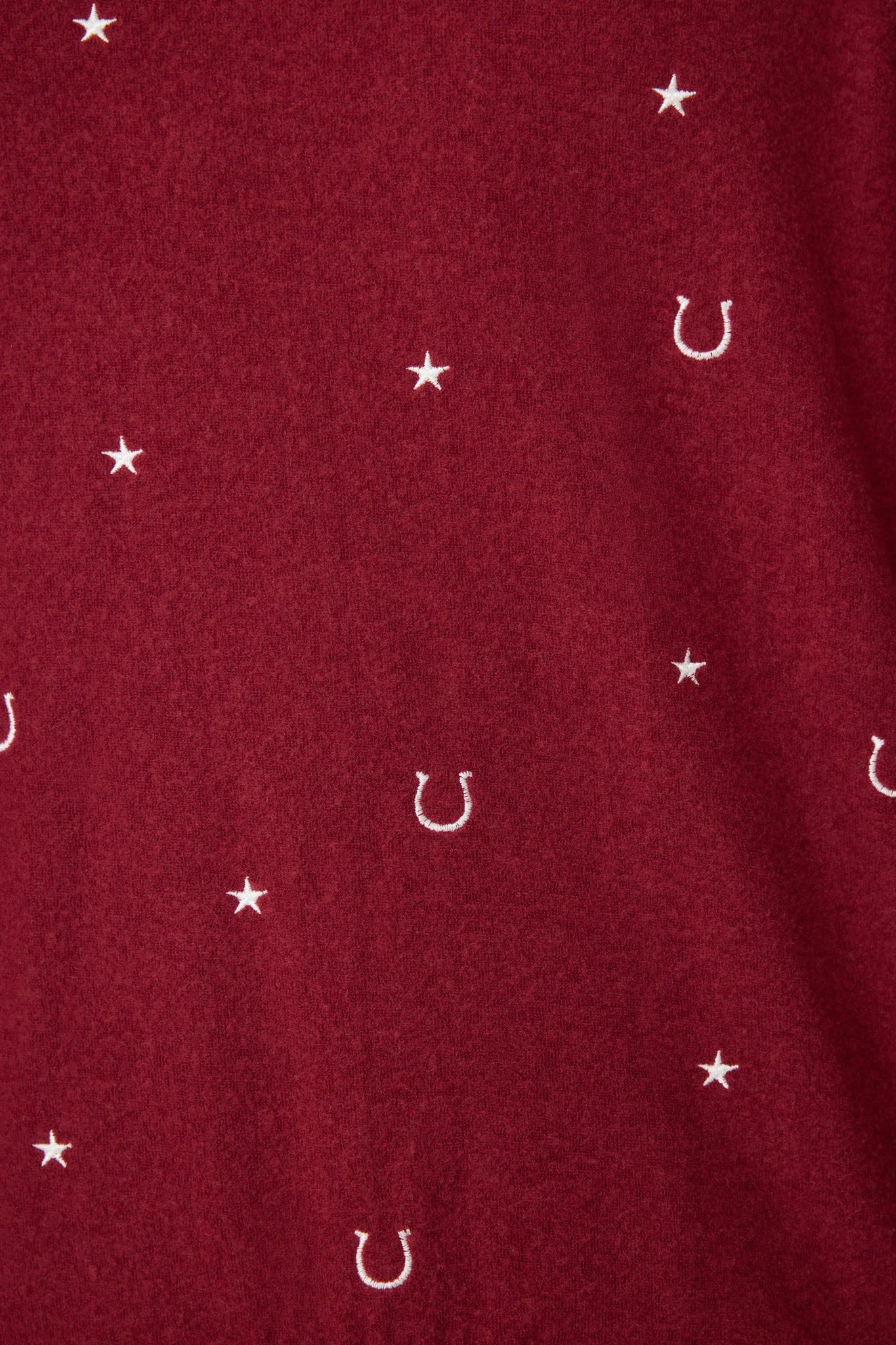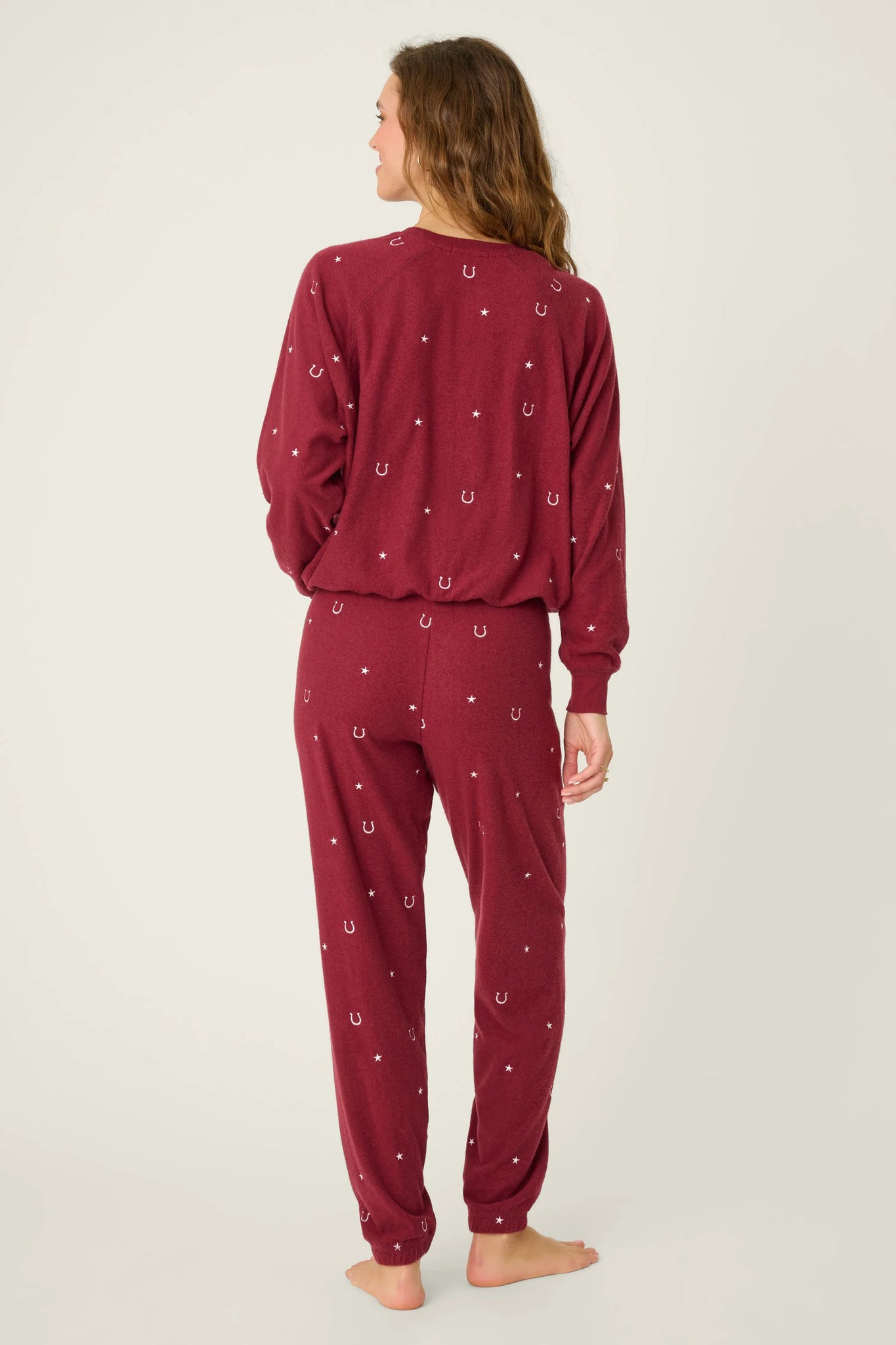 Double the cozy, double the charm. Part of a two-piece fleece set featuring a long-sleeve crewneck and matching banded lounge pants, both in burgundy with white horseshoe and star prints for a Western wink.