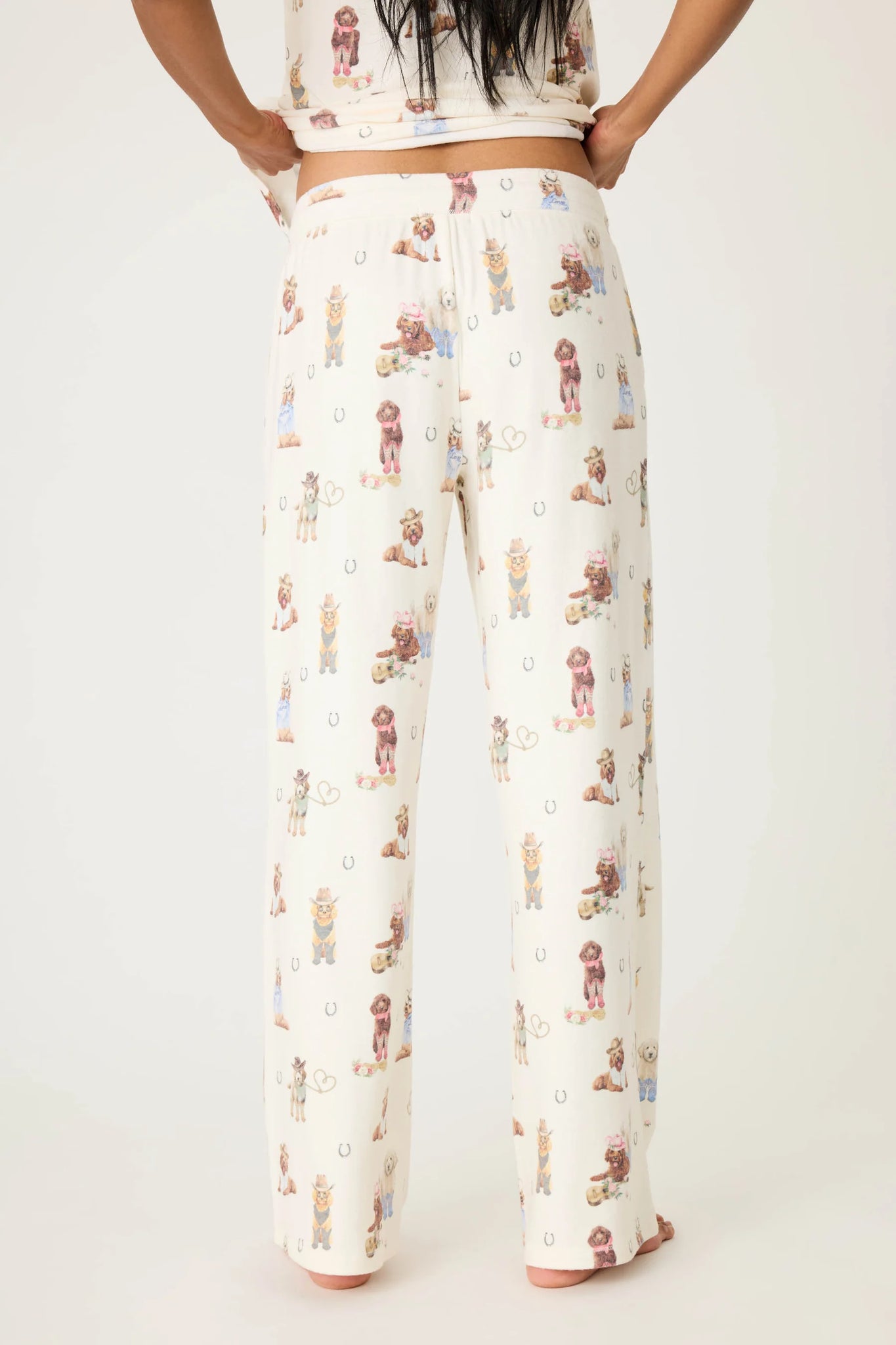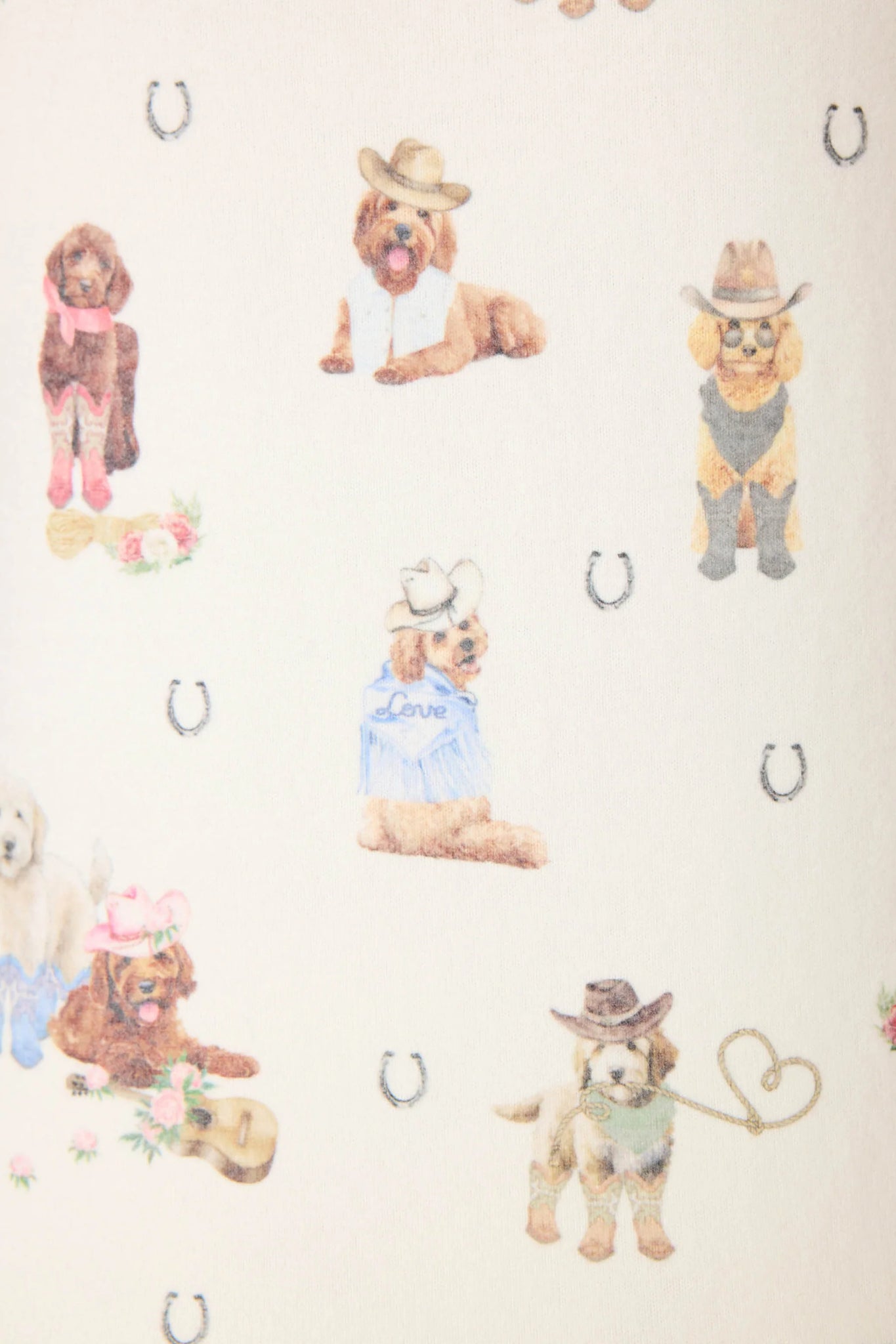 Round up some cozy charm. These ivory lounge pants—crafted from soft peachy jersey—feature a relaxed fit, drawstring waist, and an allover western dog print with cowboy hats, boots, guitars, horseshoes, and playful pups ready for the rodeo. Perfect for pairing with the matching top for a look that’s paws-itively adorable.