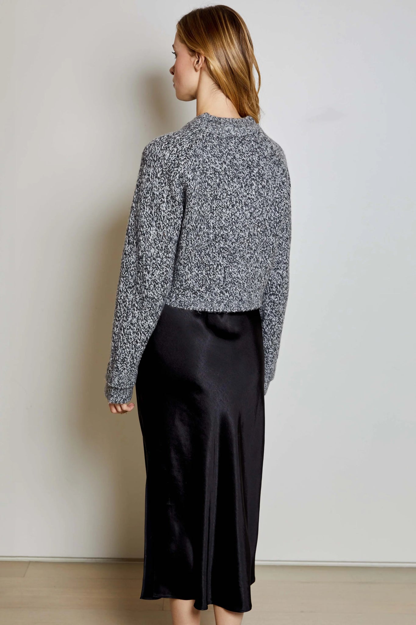 Crewneck sweater has double layer trim at neck and cuff. Bias slip dress with adjustable straps and left side hem slit.