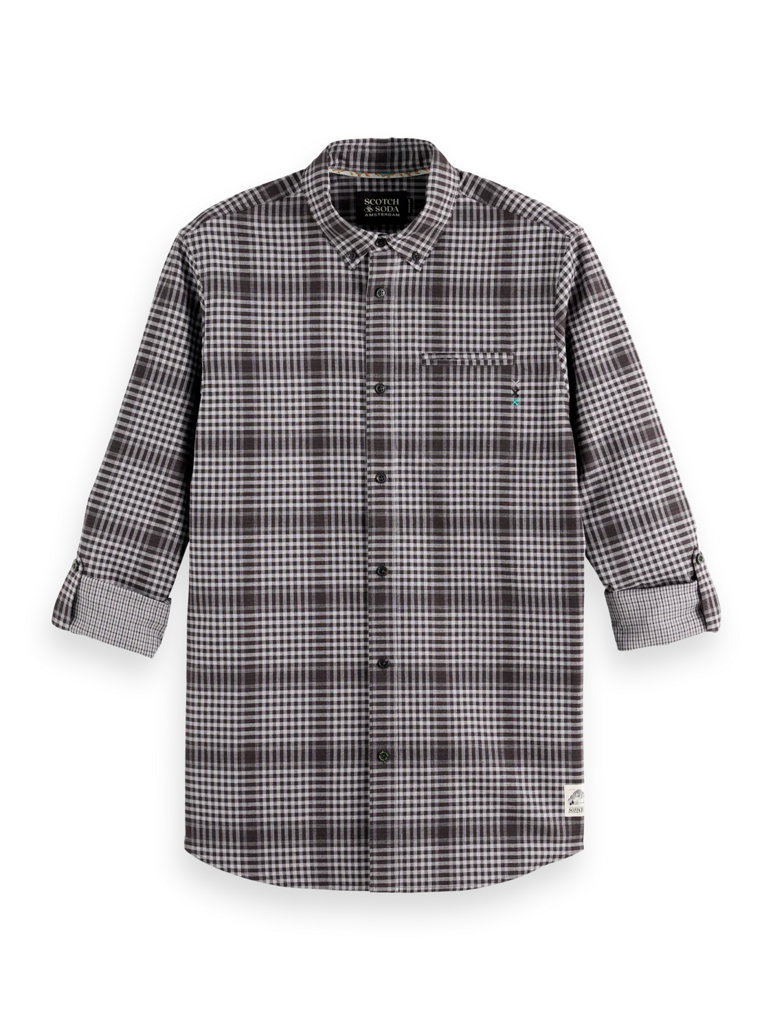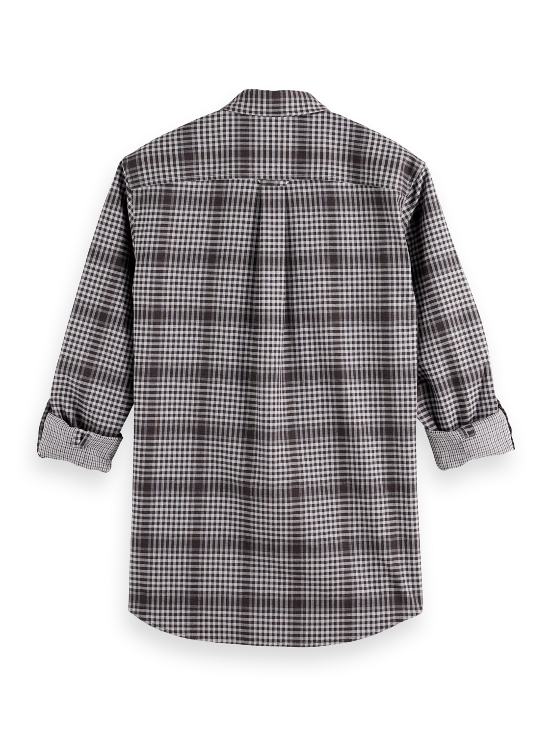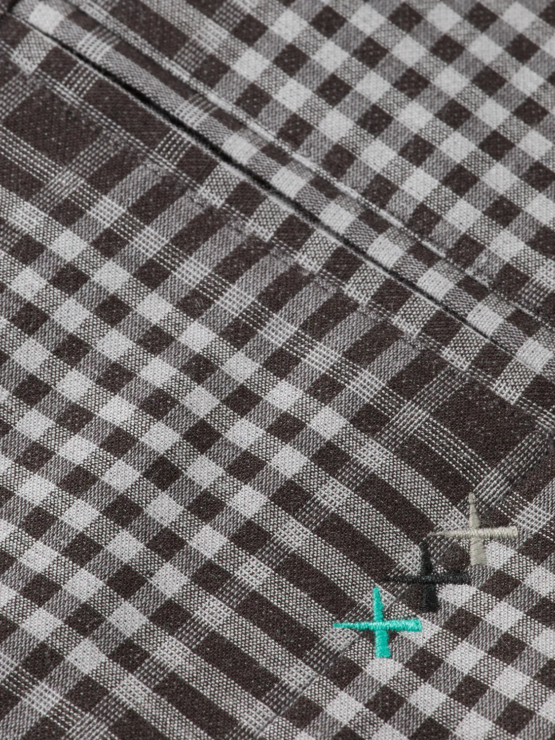 This checkered button-up is all about functionality meets style; pockets for practicality, folded cuffs for flair, offering a collared, long-sleeve design that makes a statement in effortless fashion. A double-faced shirt with subtle shadow-check patterning and soft structure.
