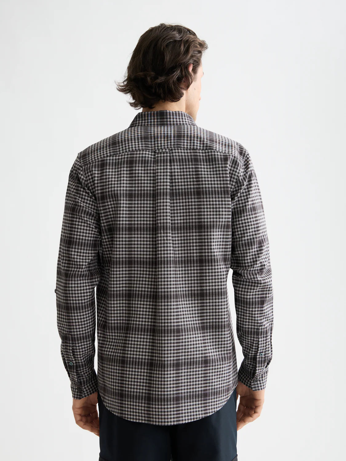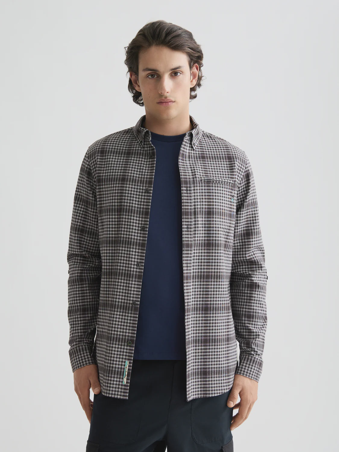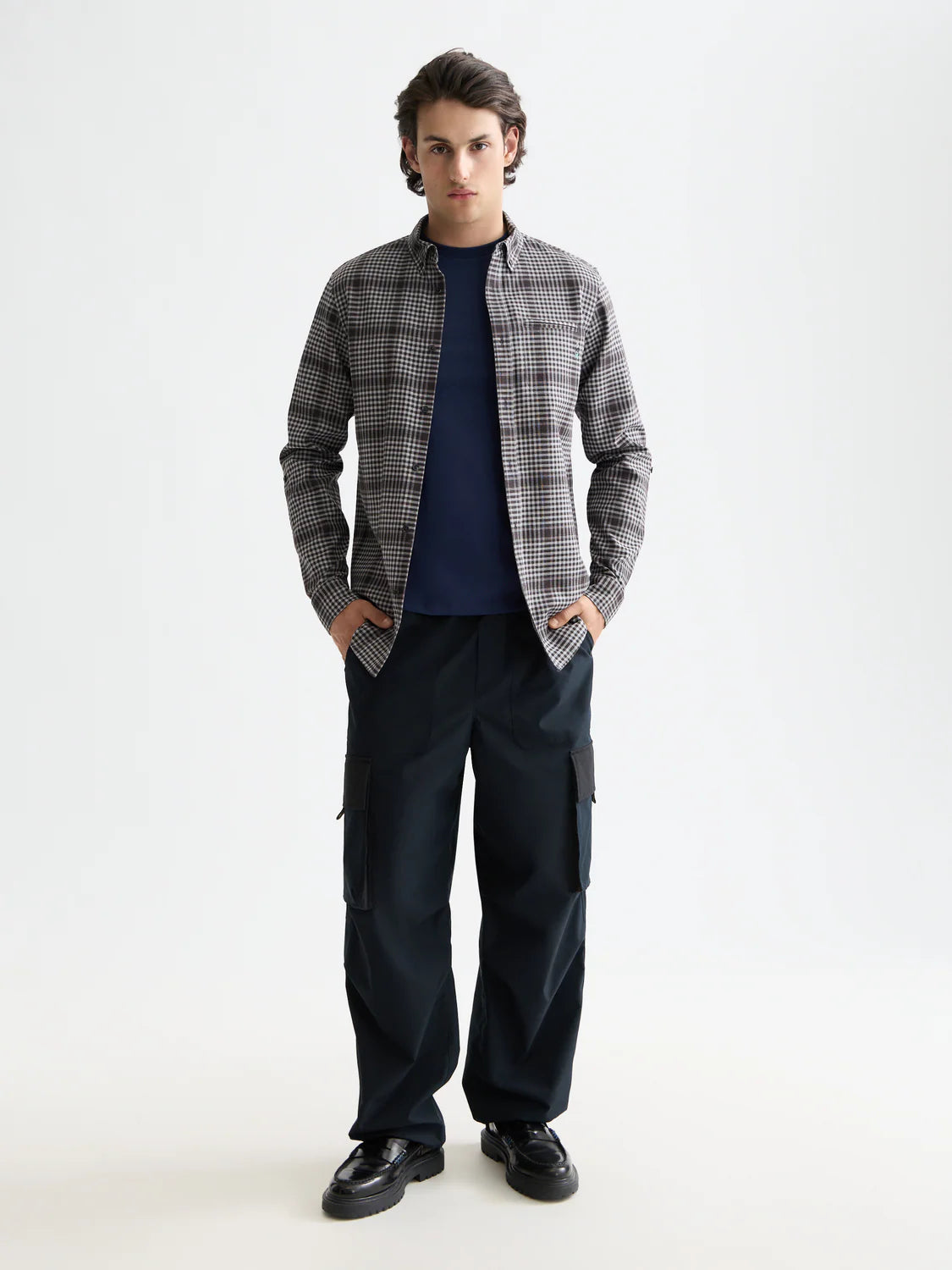 This checkered button-up is all about functionality meets style; pockets for practicality, folded cuffs for flair, offering a collared, long-sleeve design that makes a statement in effortless fashion. A double-faced shirt with subtle shadow-check patterning and soft structure.
