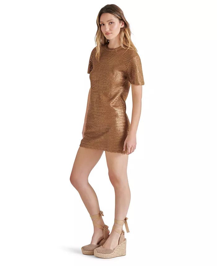 The Steve Madden Santana Dress is a striking choice for sun-drenched days, featuring a shimmering metallic gold finish and an intricate open-knit crochet texture. This elevated t-shirt dress silhouette is designed with a classic crew neckline and short sleeves, offering a breezy, leg-baring length that transitions perfectly from the beach to an evening out.