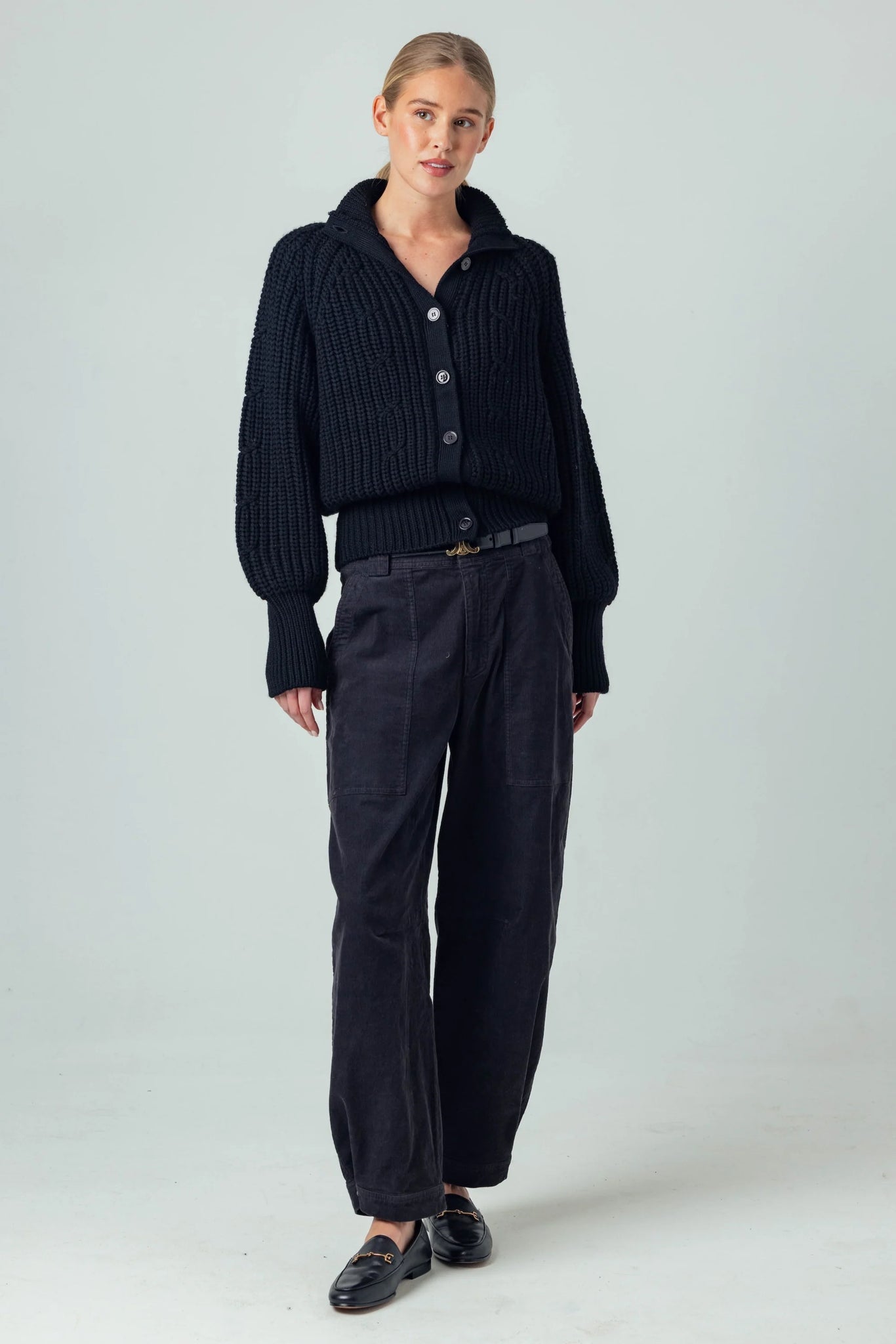 The Briar is crafted in an oversized chunky yarn knit. Designed with a button-front body and a wide foldover collar, it’s balanced by a fitted waistband. Voluminous sleeves taper into neat ribbed cuffs for a cozy yet refined finish. Wear alone or layer over your favorite ribbed tees.